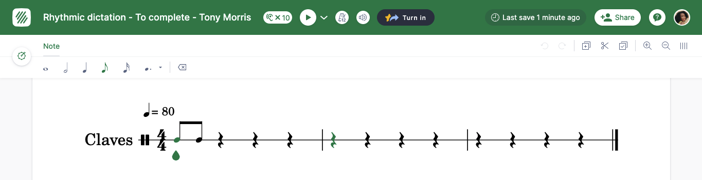 - Creating the full score using Flat for Education, then using the playback sound of the complete score in your assignment template. For this, see the second example below (Rhythmic dictation).